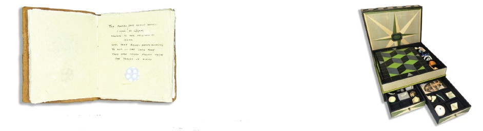 A particularly emblematic work from the collection is The WunderCabinet (2011) (pg.53) by Barbara Hodgson and Claudia Cohen, a 21st-century interpretation of the historical cabinet of curiosities. This intricately crafted piece includes a miniature cabinet filled with over eighty carefully selected objects from the artists' own collections: fossilized shark teeth, optical lenses, seed pods, glass eyes, and more. At its core is a finely produced book, printed by hand, coloured, collaged, and bound with obsessive detail, divided into two traditional categories of wonder: Naturalia and Artificialia. This “movable museum,” as scholar Kristen Renzi3 describes it, collapses boundaries between book, box, and exhibition, mirroring Gaia's curatorial spirit as a space of wonder, reflection, and layered meaning.