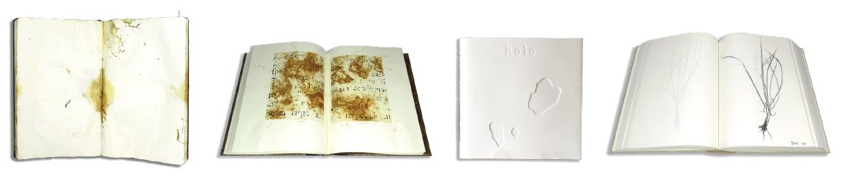 Turning to a small selection of the many books chosen for this exhibition, one of the most unusual is Necrophagus (2013) (pg.57) from the series Somata by Kathleen Sawyer. Unlike John Carrera's Putrefatti (1995) (pg.42) and Ryoko Adachi's Hole - From My Beanstalk (2008) (pg.52) in which the activities of insects and the resultant denudation of the substrate are imaginatively etched, typographically and photographically depicted on the page, Necrophagus presents the actual decaying of the book's material as a found object. The pages are stained, wrinkled and eaten away by liquid, soil and insect agents; these indexical traces embody the history of the book as a skin and organs that have experienced such attack, aging and decay. Onto the distressed pages Sawyer has drawn minute pen images of the larva (maggot), pupa, and adult of the probable fly that co-authored this work. The American photographer Rosamond Wolff Purcell (born 1942) is known for her photographic works that explore subjects in natural history, science, and biology, including the aestheticization of the decaying book. Her work has inspired research on the topic of books in the air and atmosphere, and on insects and archives and how one thinks about insect damage and books not simply as something that you must read around, but how one would read with the insect or damage.