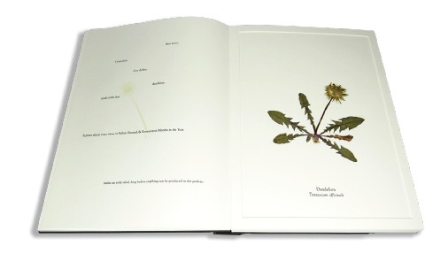 The herbarium sheet containing a pressed two-dimensional specimen is represented on this exhibition by two intriguing books. The first is 16 dm2 an essay (1979) (pg.29) by Dutch-born horticulturist, biologist and ecological artist Herman de Vries. The book contains a series of 473 plants, collected from a 40 × 40 cm section of meadow near Eschenau, Austria. The book is divided into 16 parts, each representing one of the 16 squares into which the plot of land was divided, and the plants are reproduced in greyscale Xerox-copy on A4 paper. The location of each plant is marked and numbered on the front of each page. De Vries provides photographs of the chosen patch of meadow before and after the excavation, and this evidence suggests that each plant is reproduced to its true scale, avoiding the aforementioned folding over double of specimens or downwards or sideways pasting of others. 16 dm2 an essay is a fascinating intersection of book art and herbarium, conceptual artwork and scientific enquiry.