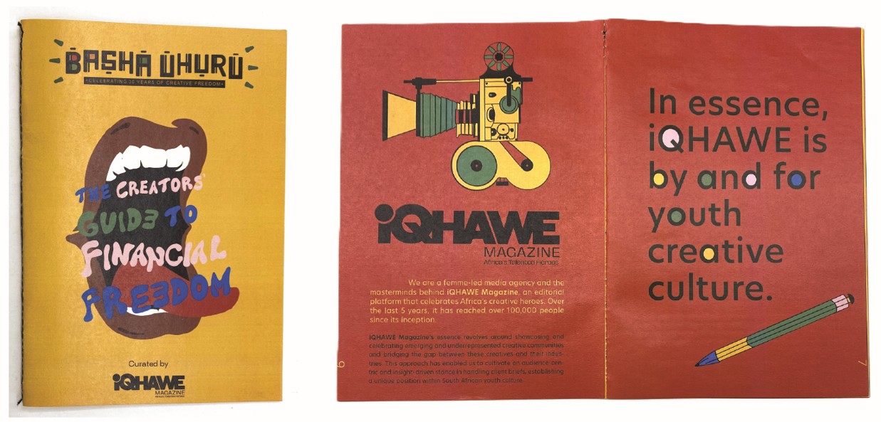 Minenkulu Ngoyi, Issac Zavale, Renaè Mangena & Anastatia Nkhuna, iQhawe Magazine: Basha Uhuru (2024). Covers (l) and internal spread (r). Photographs: David Paton