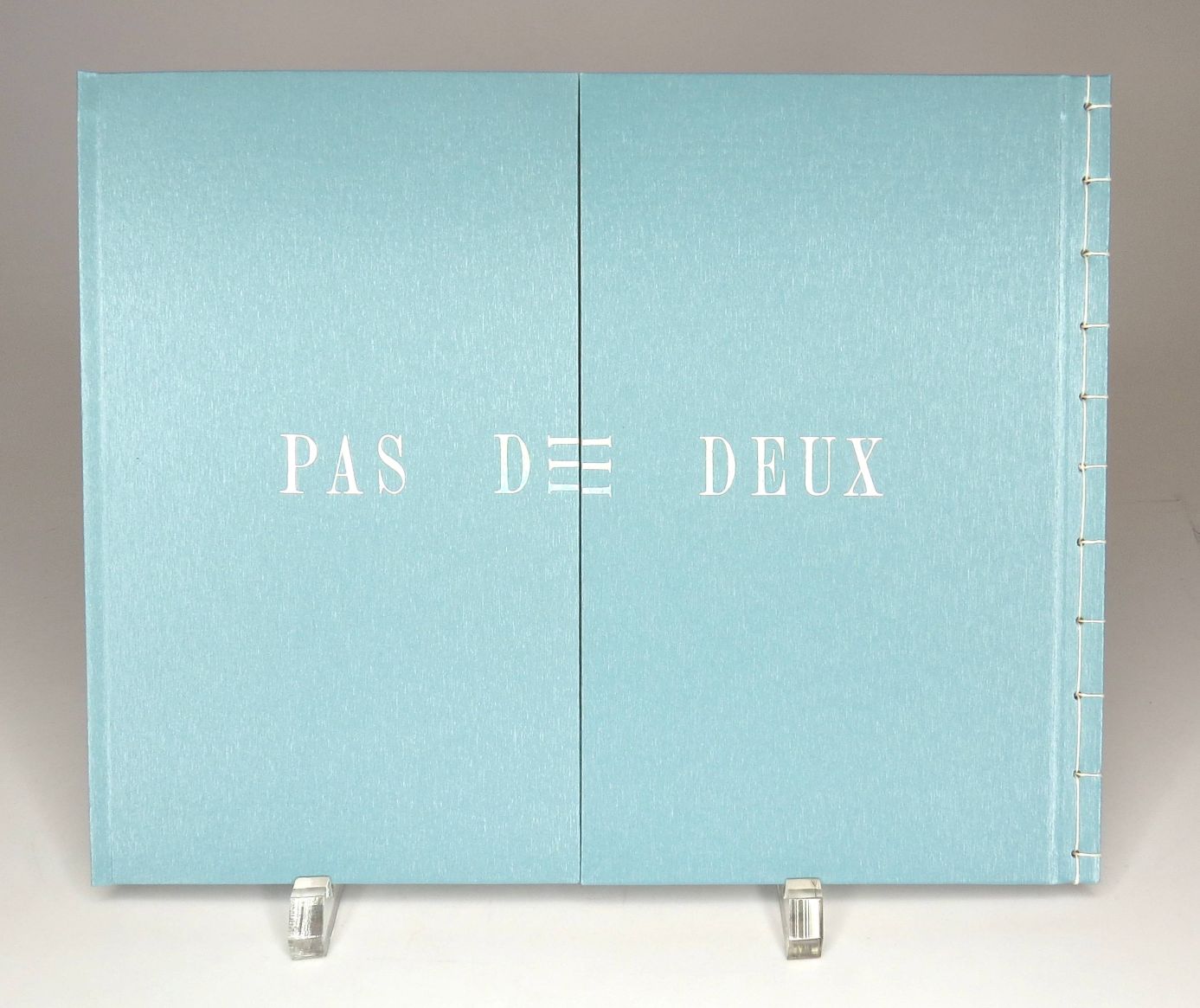 Additional notes: Innovative design with a right and left spine but common back cover, folded towards the middle, the former stitch bound and the latter Japanese stab bound. The title flows across both closed covers. The box is contained in a blue box which is larger than the book which fits on top of the space beneath, making it more substantial.
