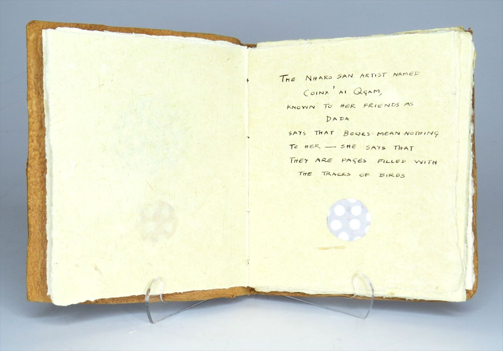 Additional notes: Colophon: "Made on reject River Reed paper and bound in goat skin tanned at the Kuru Bushman Development Project at D'Kar in the Kalahari where Dada lives and works. One of two similar copies, the other of which belongs to Judith Mason's travelling library".