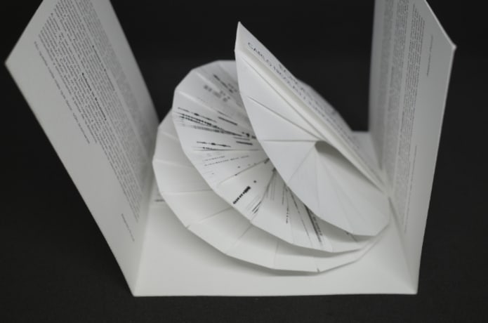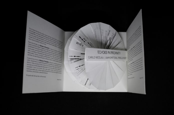 Additional notes: This paper CD contains the music composed by bass player Juan Cristobel Perez Grobet based in Mexico and violinist Carlo Nicolau based in New York. They wanted to publish a cd rom with their music and asked me to design a special project. Today we don't need cliche CDs anymore so I decided to make an object with the visual components of music. the audio registration of the music is printed in the paper CD which opens as music plays.