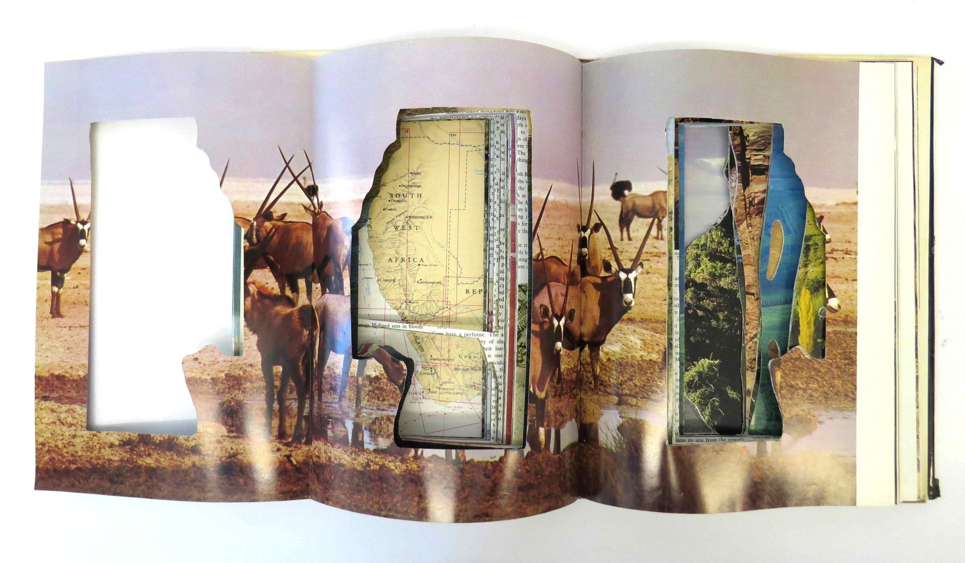 Additional notes: In the art making process of LAND OF SPLENDOUR, the book with its scenic photography is irreparably transformed and damaged. This procedure is analogous with incursions of sports facilities on the South African landscape.